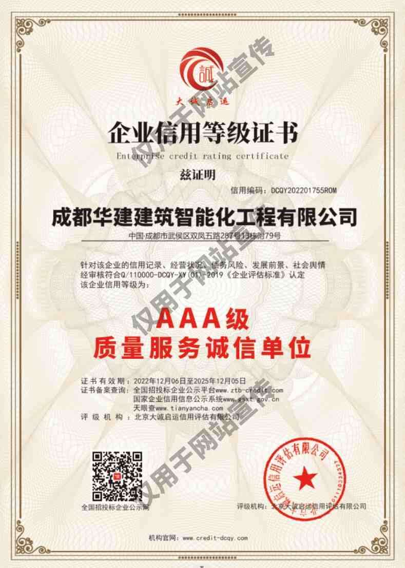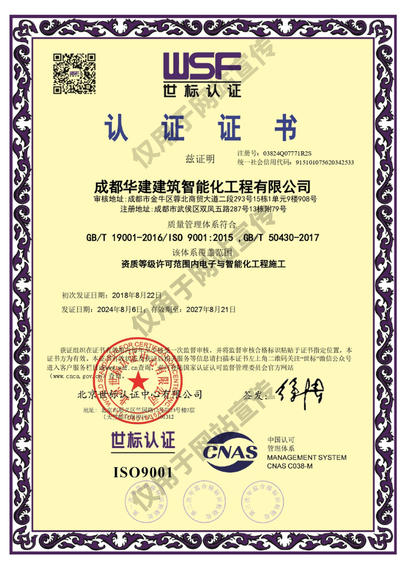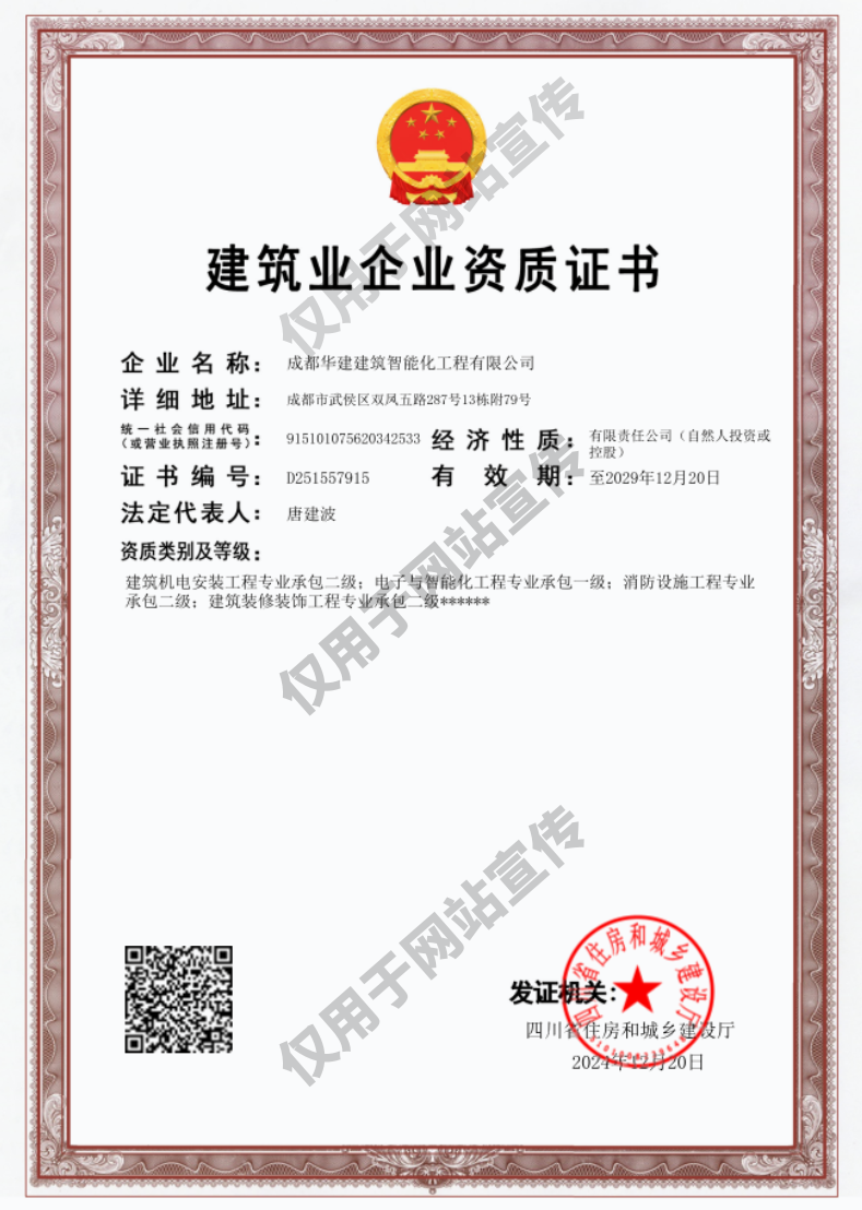 成都華建建筑智能化工程有限公司,19年專注弱電智能化工程、消防工程、建筑機(jī)電安裝工程的專業(yè)公司,具備電子與智能化工程、消防設(shè)施工程、建筑機(jī)電安裝、建筑裝修裝飾、建筑智能化設(shè)計(jì)等相關(guān)30余項(xiàng)資質(zhì)及證書。設(shè)計(jì)、施工和維保一站式服務(wù),多行業(yè)中大型成功交付案例。…